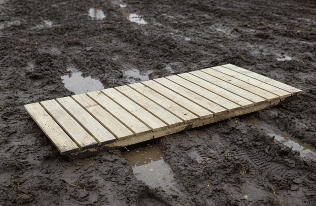 Overfladen består af tykke brædder, understøttet af to solide tværgående lægter – robust konstruktion, der tåler daglig brug under krævende forhold.